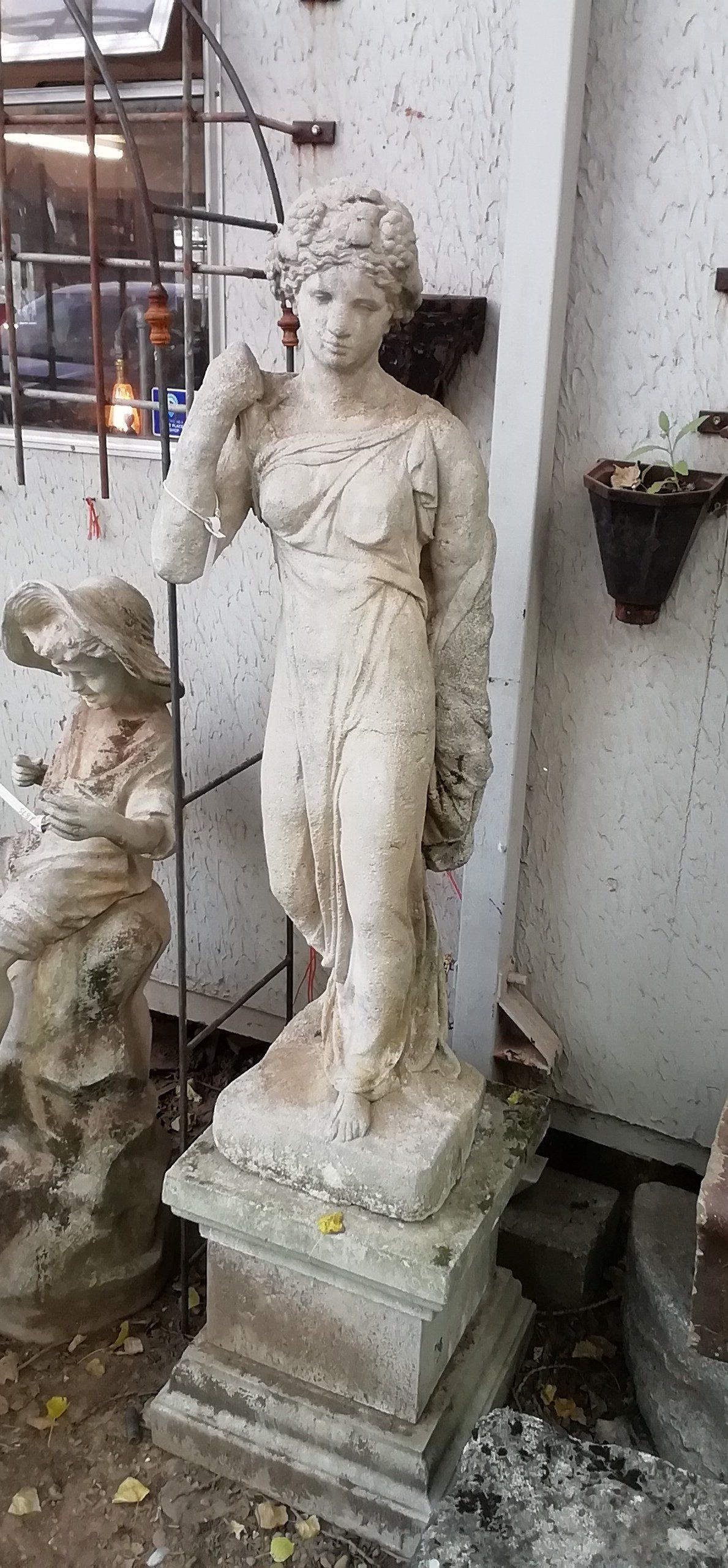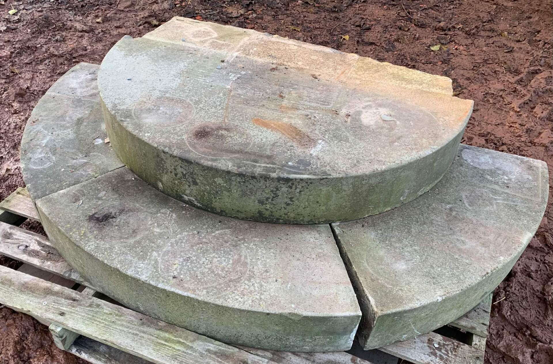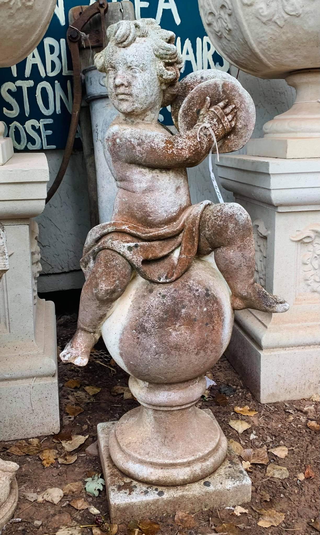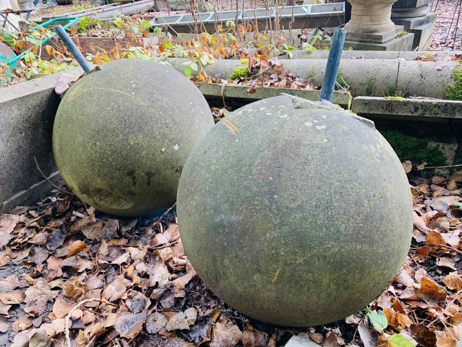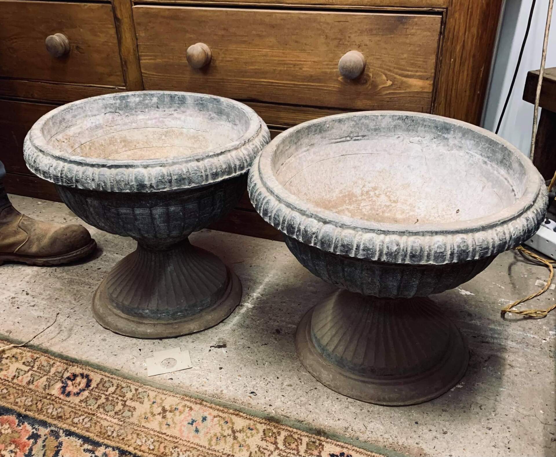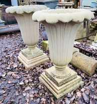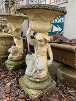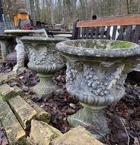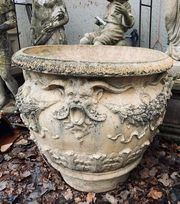 Wonderfully ornate composition stone lemon tree pots featuring Satyr faces, swagged leaf and flower garland and acanthus leaves decorating the base.